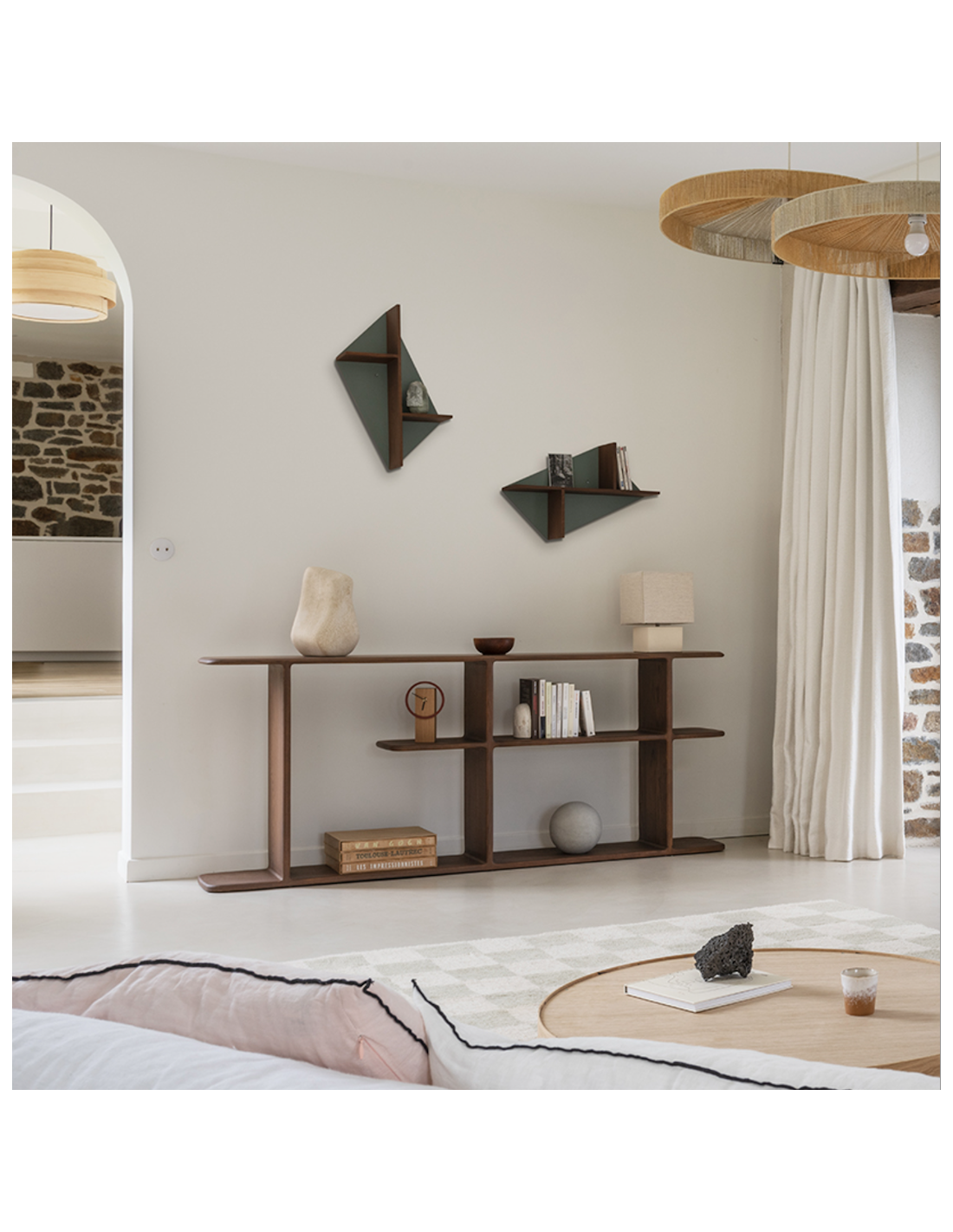 Au dos d’un canapé, dans une entrée, en séparation d’espace, la TÉHÈME basse est utilisée de plusieurs façons : bibliothèque, console ou claustra, elle joue aussi son rôle de meuble d’appoint pour exposer un vase élégant, un beau luminaire, un objet original…