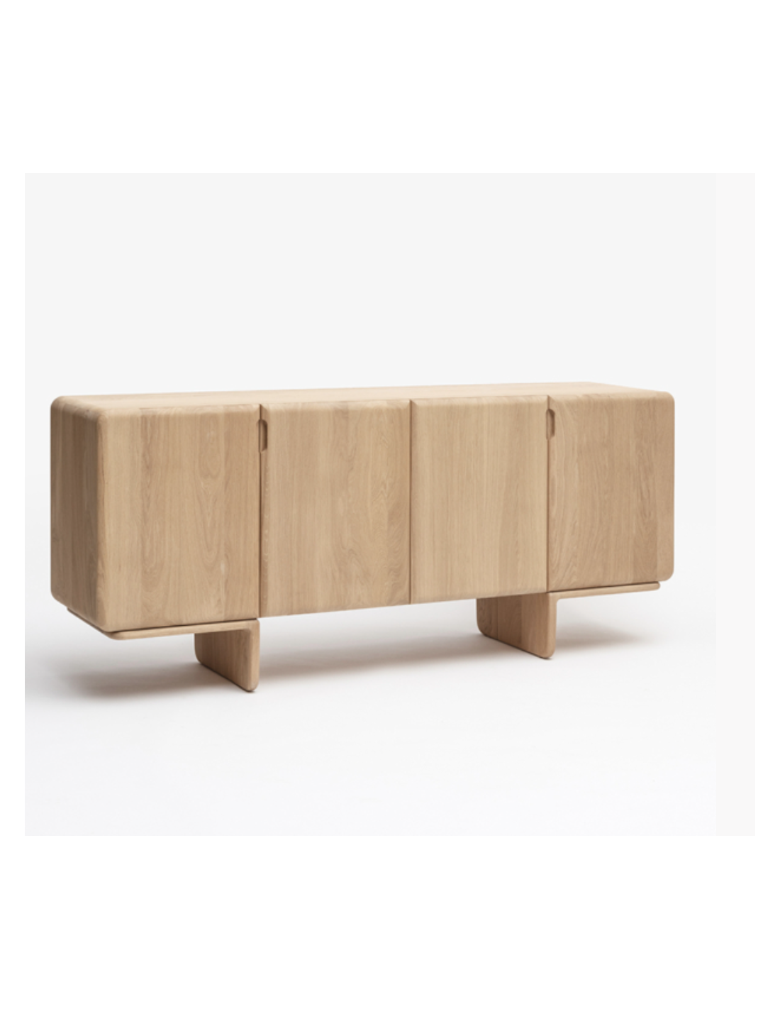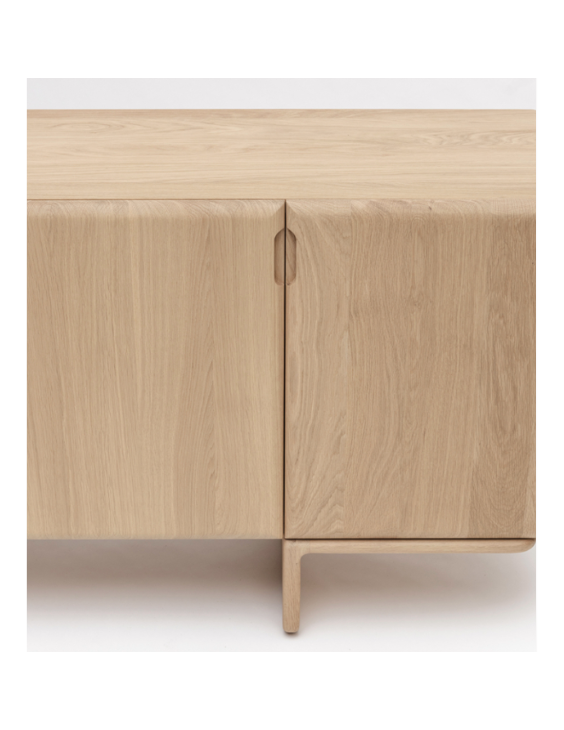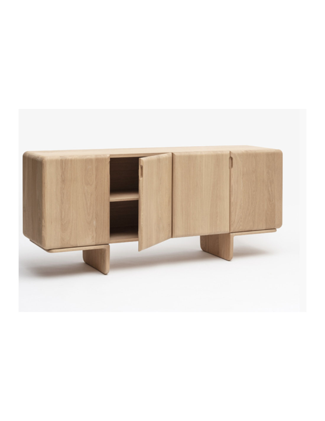 Le travail des ébénistes et la sensualité du chêne massif se révèlent dans les lignes arrondies et douces du buffet TÉHÈME : poignées creusées dans le bois, charnières freinées, assemblages parfaitement ajustés, ponçage manuel des moulures. Livré avec deux tablettes amovibles.